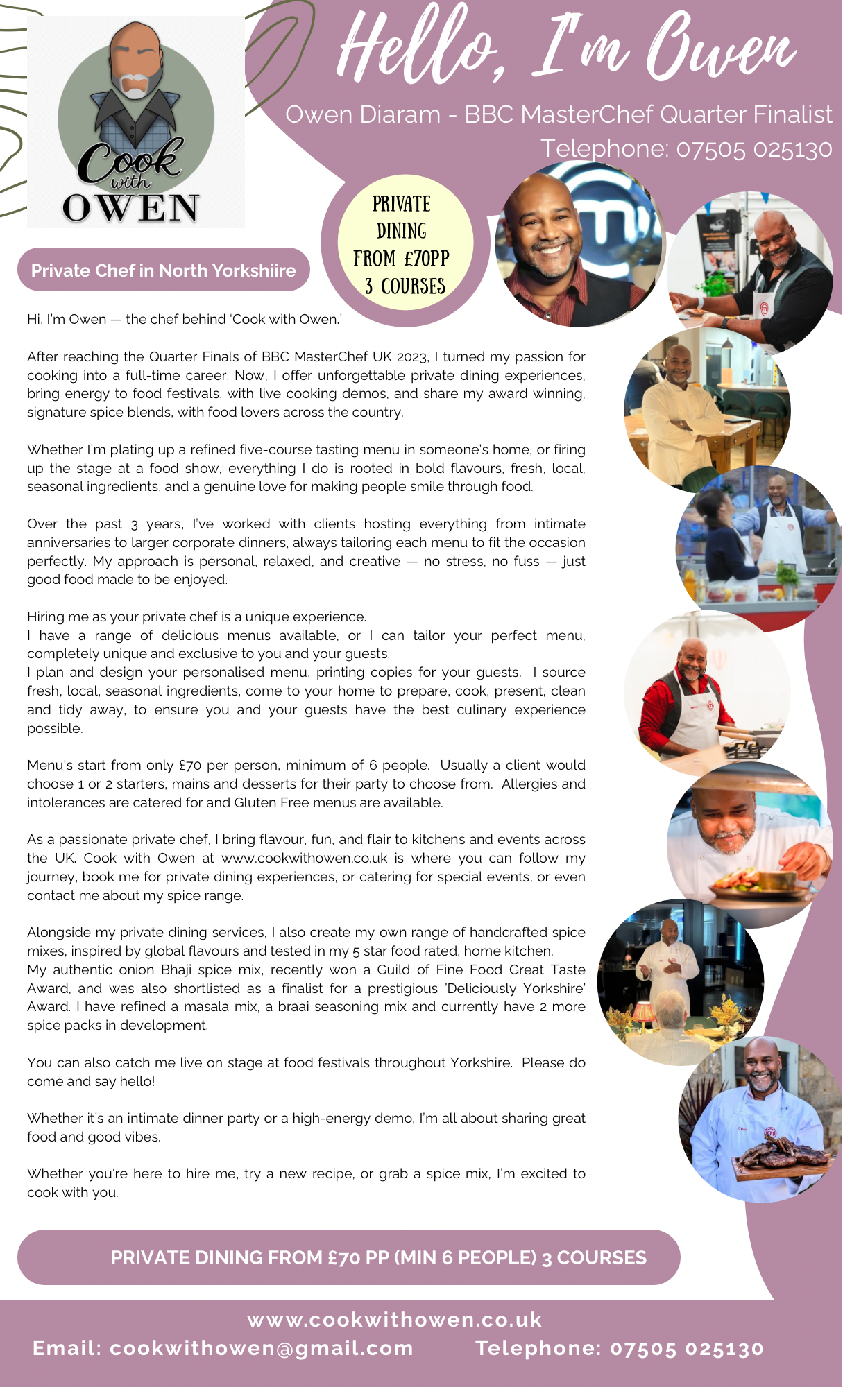 Hi, I’m Owen – the chef behind the event company - Cook with Owen. After reaching the Quarter Finals of BBC MasterChef UK 2023, I turned my passion for cooking into a full-time career. Now, I offer unforgettable private dining experiences, bring energy to food festivals, with live cooking demos, and share my award winning, signature spice blends, with food lovers across the country.